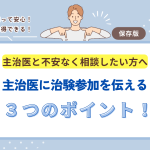 2025-02-05 / 最終更新日時 : 2025-12-01 pro-contents 通院や治験参加のお悩み主治医に「治験に参加したい」と伝える際のポイント 治験への参加は患者にとって大きな決断です。特に主治医の説得が必要になることもあります。この記事では、主治医を説得して治験に参加するための具体的な方法について詳しく解説します。 治験ってなに? 治験とは、新しい薬や治療法の […]